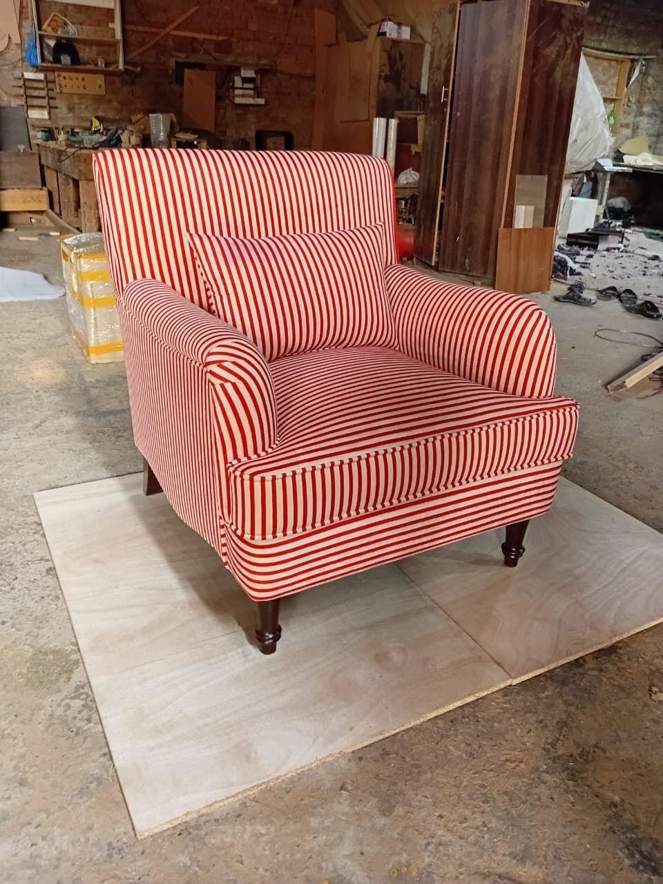 - Upholstered in a timeless yet playful Heritage Red Stripe