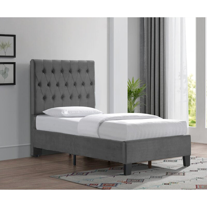 Comfort is guaranteed with the Denver Single Bed. The fully-upholstered piece features a solid-wood frame fitted with luxe grey velvet fabric and diamond tufting on the headboard. The frame itself is held up by block powder-coated legs.