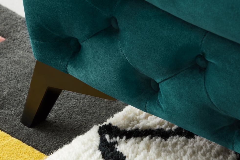 The perfect combination of traditional and modern designing, the Diva Double Seater is a beautifully eye-catching design. The padded frame is fitted with sea green velvet upholstery to insure comfort. The frame is held up by walnut-hued wooden legs.