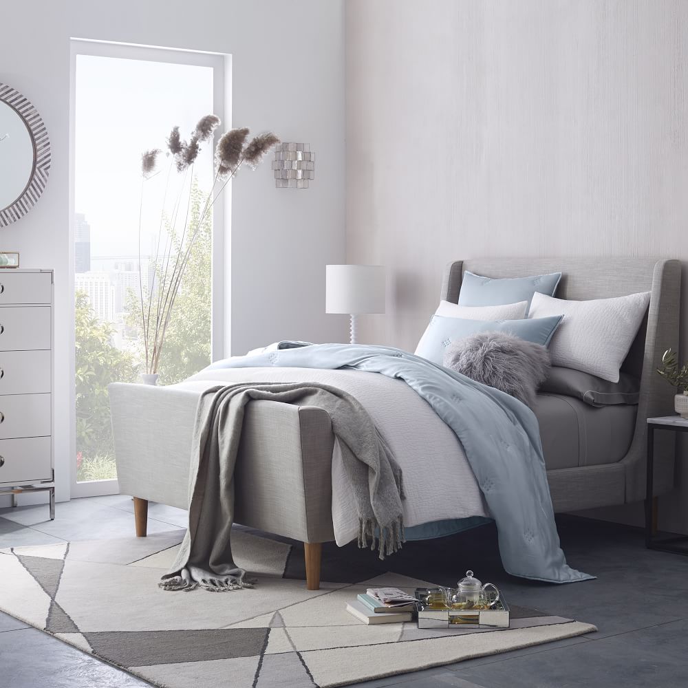 We wish you pleasant dreams with the Janine Upholstered Bed. The contemporary style design features an elongated headboard & footboard with curved sides to heighten the comfort. The frame itself is help up by tapered wooden legs and fitted with lush velvet upholstery.